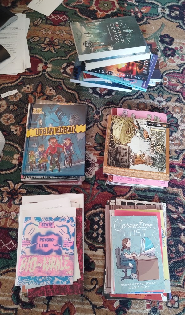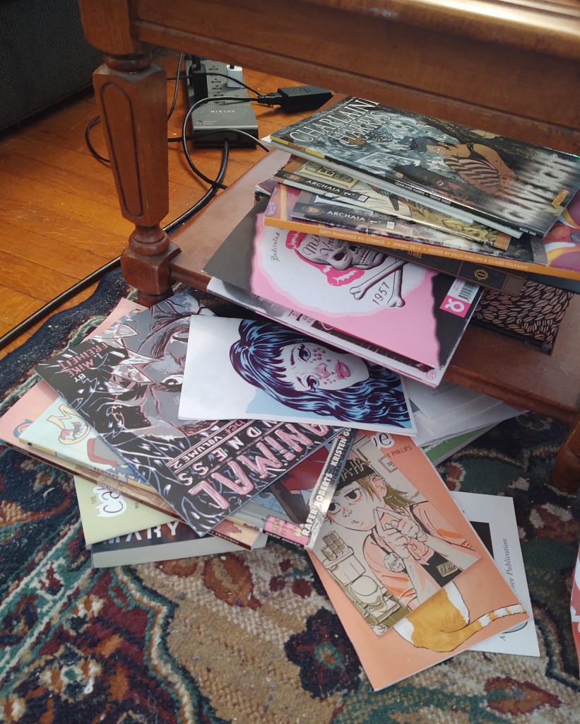 Everything that didn’t make it into the magazine boxes was sorted into one of three piles: zines to be donated to local zine libraries, zines going to friends, and floppies to be donated to academic libraries with comics collections. While I was at it, I also combed through my ARCs and giveaways, weeding out anything I didn’t need anymore. The end result was five piles on my floor.