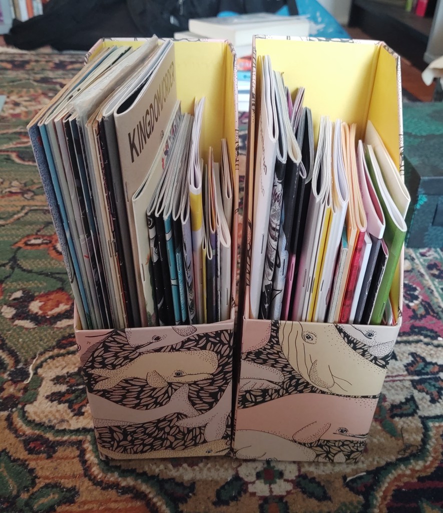 It was time to evaluate my collection with a new set of criteria. Instead of “Does this bring me joy?”, I had to reflect upon each zine with “Does seeing this cover bring me joy? Will seeing this cover displayed face out in my living room increase the chances of me picking it up and flipping through?” The “no”s were put aside with the rest of the carpet mess.