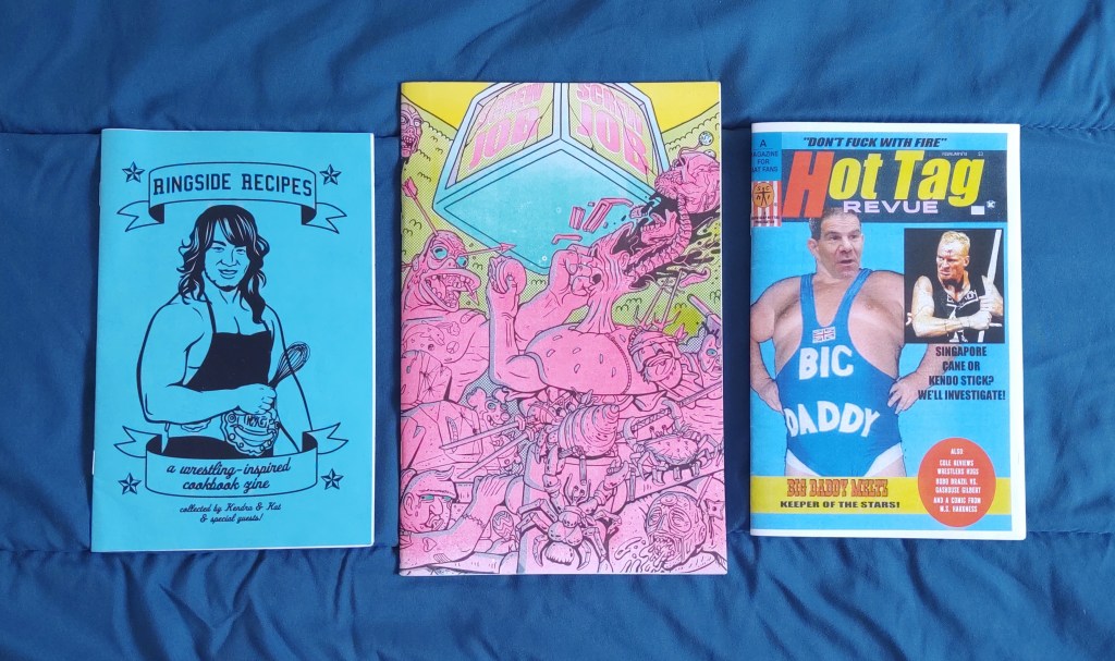 Scroll past this picture of my bed for a list of wrestling-themed zines and micropress reads.