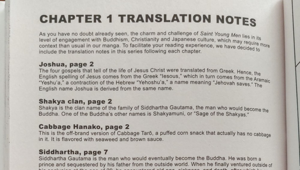Back in December, I was gifted the brand-new, North American Saint Young Men volume 1 omnibus. The very first thing I noticed as I excitedly flipped through was that translations notes, however short, were featured after their respective chapters rather than compiled into one section in the back.