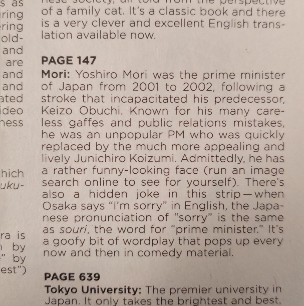My Azumanga Daioh omnibus is the 2009 Yen Press edition, but I remember seeing translation notes in the first ADV Manga editions back in 2004, albeit they might have not been much beyond explanations of honorifics and the Japanese school year. (If anyone happens have those volumes lying around, feel free to check and get back to me.) This memory got me wondering how translation notes may have developed and evolved since I first started reading manga in my teens.