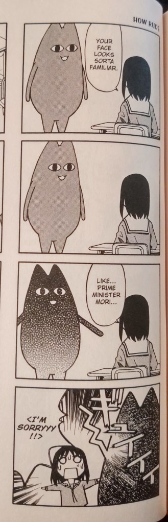 The magic of Saint Young Men‘s editorial notes was still fresh in my mind a couple weeks later when I started reading Nichijou, which made the absence of translation notes in the first volume of the latter even more shocking and devastating to me. Nichijou is a gag manga, and puns are common in Japanese gag jokes. They can also be a huge pain in the ass to localize. While it is possible to tweak and rewrite punny punchlines into something vaguely comical to English-language readers, I’m a sucker for linguistic context. For example, here’s a strip from the ever classic 4-koma Azumanga Daioh and its accompanying translation note: