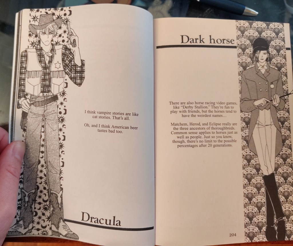 The entire TokyoPop run of Matsuri Akino’s Pet Shop of Horrors happens to be sitting on my bookshelf, so I did a quick read through of volume 4 to refresh my memory and compare how its notes with Suppli’s. As I expected, they are very different. Volume 4 had no editorial notes in the back or within panels, and the few notes the series does include are directly from the author. These notes cover the cultural and biological contexts of the creatures featured in the volume rather than localization issues. Since these notes are from the author, they also contain personal anecdotes and thoughts, unlike the (usually) neutral editorial voice of translation notes.