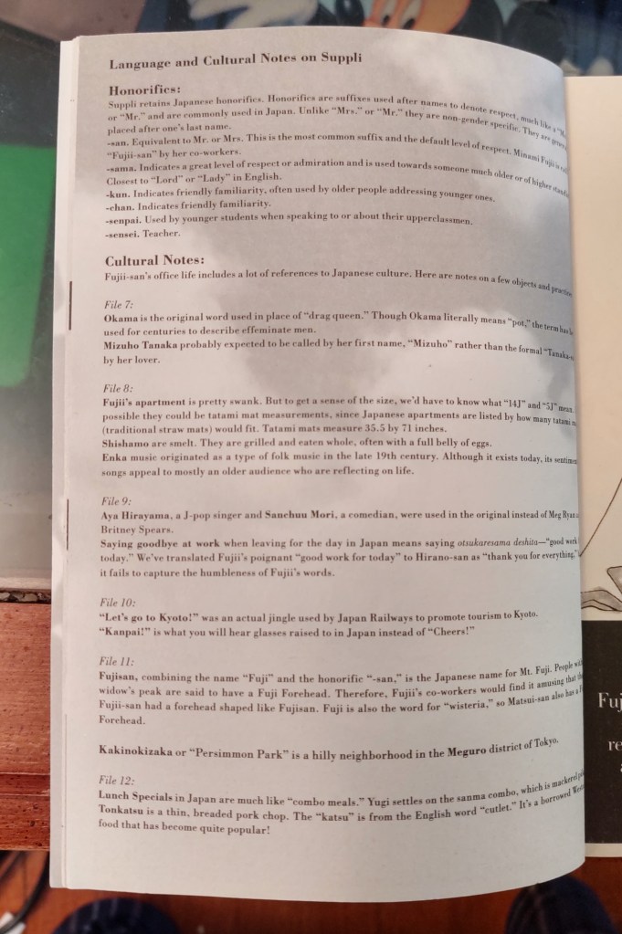 Two weeks into our ongoing quarantine, I ordered volumes 2 through 5 of Mari Okazaki’s Suppli, a josei manga first released in America by TokyoPop in 2008. (TokyoPop only made it through volume five before its 2011 shutdown, and Suppli‘s current licensing status is a tragic mystery.) Volume 2 features a page of “Cultural Notes” in the very back, between the volume 3 preview and TokyoPop ad placements. These notes cover honorifics, slang, and pop culture references. There are also a few comments on localization choices, such as the decision to translate “otsukaresama deshita” as “thank you for everything.”