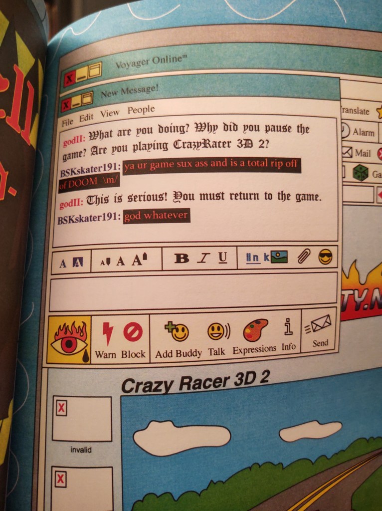 Wylesol takes us back to the age of AOL instant messenger and popup advertising in this tale about a demonic cult’s viral uprising and the teenagers tasked with thwarting them. Told entirely through early aughts desktop user interfaces, the result is a thrilling exercise in visual literacy. Also, check out those fonts.