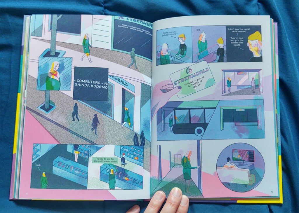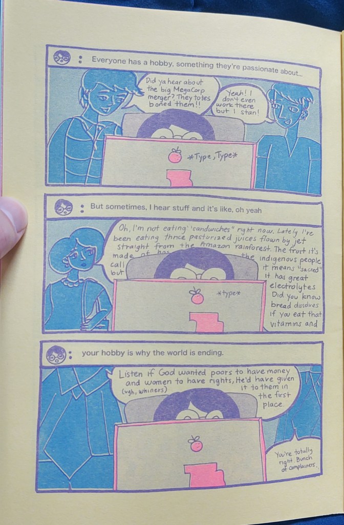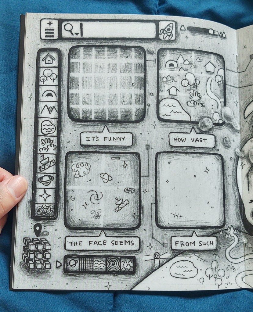 A gorgeously printed risograph minicomic about four BL fangirls retreating to their group chat to cope with the outside world and the “outside” internet. The first work that comes to mind when I talk about the online spaces we’ve “built” for ourselves.