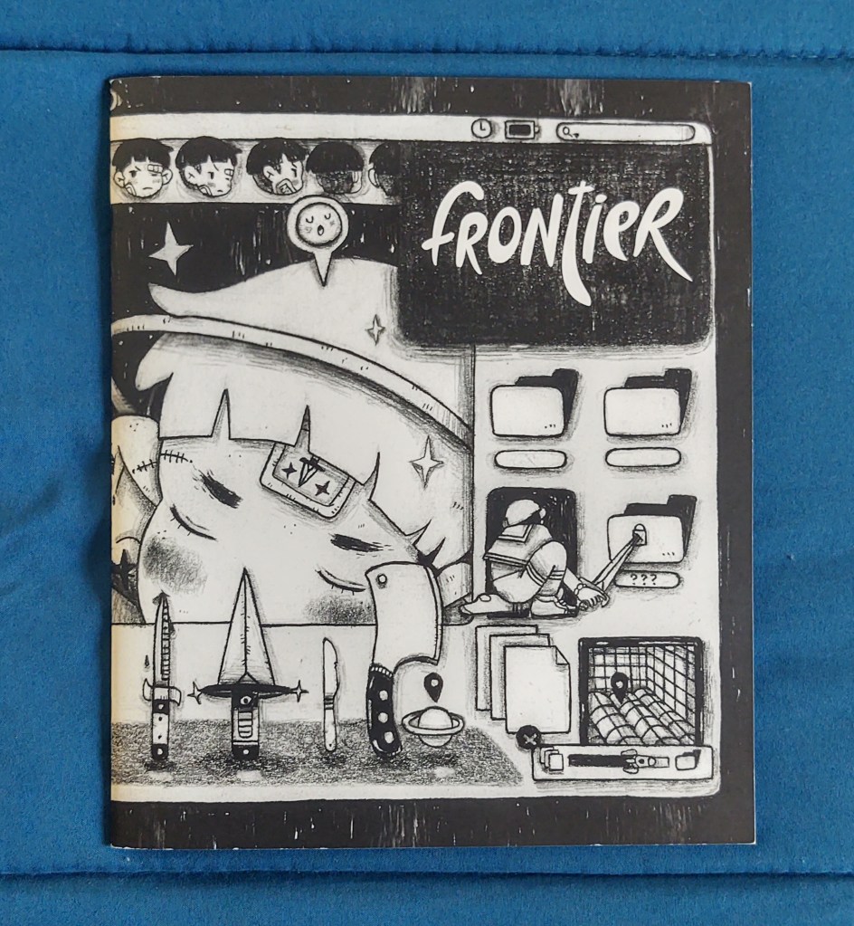 Frontier is Youth in Decline’s quarterly artist showcase publication. The twelfth issue by Kelly Kwang starts out as a sort of roleplaying overview with character profiles and story logs and then transitions into reflections on loneliness and yearning. Most of the contextual information is categorized via file folder icons and framed within web browser windows, visuals that conflict with the smudgy grey scale art and handwritten notes that evoke the manual work of drawing in mediums like charcoal, chalk, and graphite. A contrast that I simply adore and punts me right back to my emo Livejournal days.