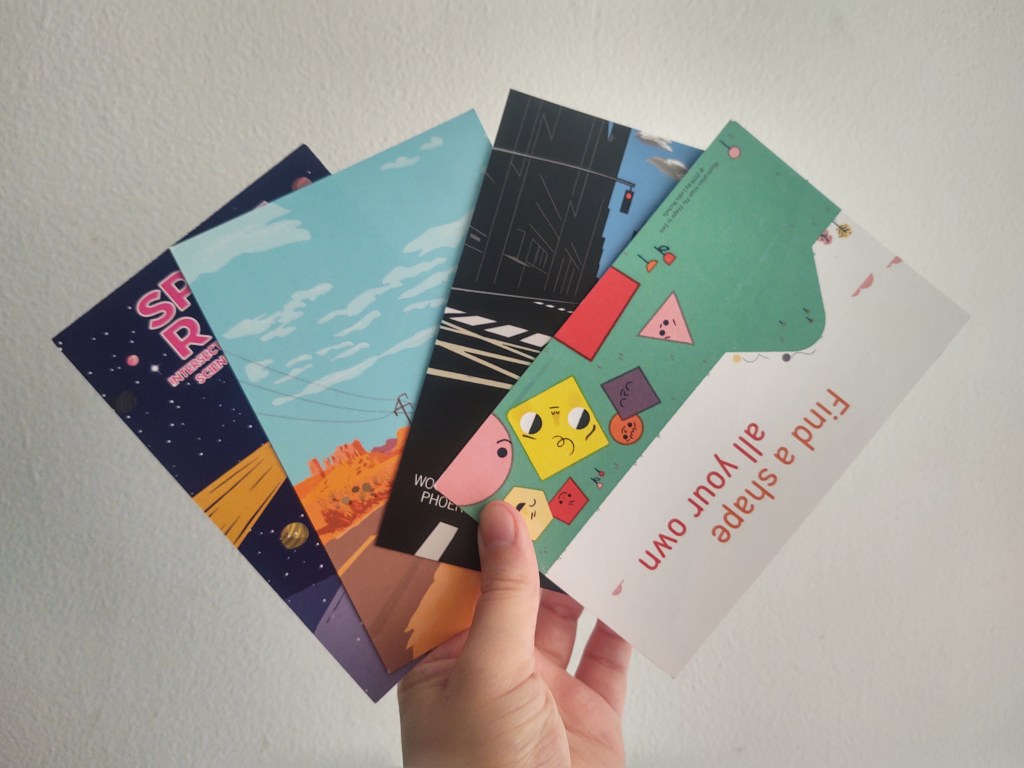Just like images and words on social media, paper promotional items can have shareable value. Leave some blank space on the back of a 5×7 promotional card, and I WILL use it as a postcard. Even before I finished writing my thesis, I was slipping stickers and pamphlets in with letters to friends who might appreciate them. And I think that’s the promotional design jackpot – marketing that inspires sharing. I bet in another two months I’ll start including some of the bookmarks I kept with my personal letters.