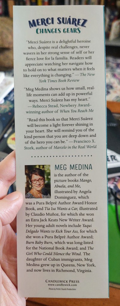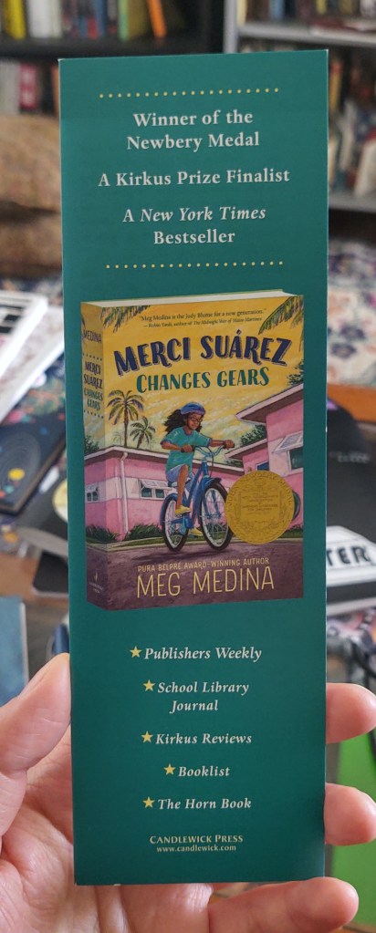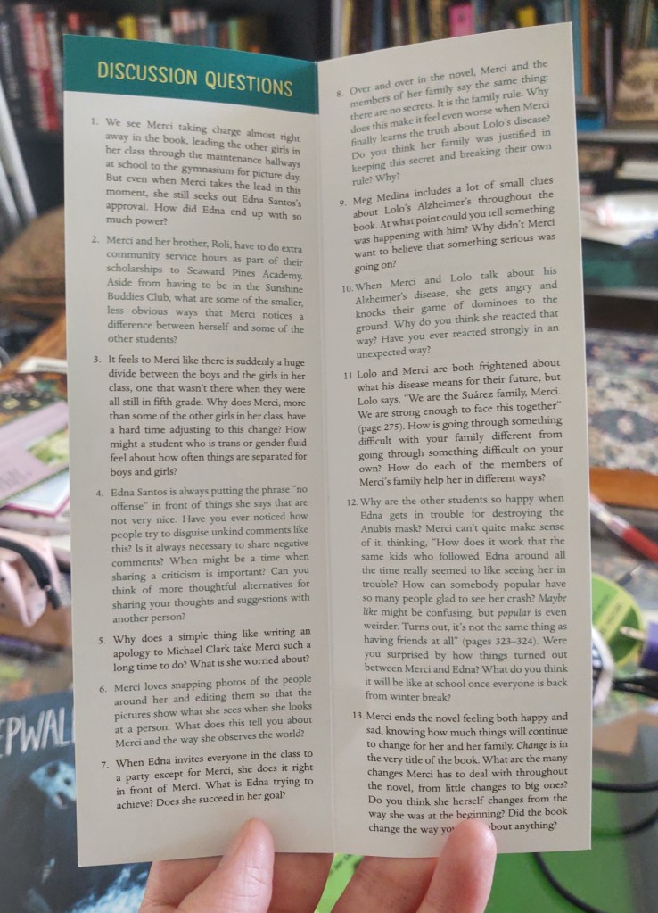 There’s this bookmark from Candlewick Press that I really really wanted to include this in my thesis analysis but didn’t because, uh, well, when the time came…I couldn’t find it. (Did I mention that I had probably over 100 marketing artifacts in various tote bags dispersed throughout my apartment?) From its display stand, it looks like the usual promotional bookmark with basic key specs: cover image, blurbs, accolades, author profile, publisher site, etc. But then you pick it up and realize it unfolds into a lengthy discussion guide. Concise, informational, and multi-functional, ingenious, I love it!