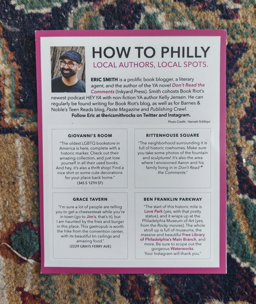 And this card was found on the floor of the Pennsylvania Convention Center exhibit hall. Judging by the book imprints mentioned (Inkyard Press for Eric Smith, Park Row Books for the author featured on the other side, Pam Jenoff), this probably came from the HarperCollins booth. What really struck me about this flyer was that the publisher feels mostly absent from it, especially since the redirects are to the authors’ social media accounts. The main focus of this promotion seems to be building a kind of trust between the reader and the authors. “Go on an adventure. Try out our suggestions. Have a great time (because you will), and then read our books.” And let me confirm as a native Philadelphian, their suggestions are excellent.