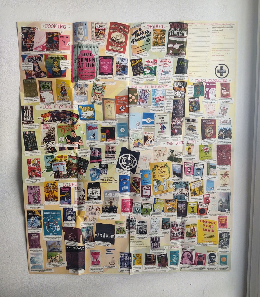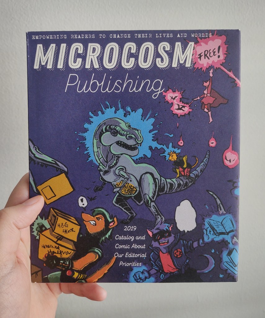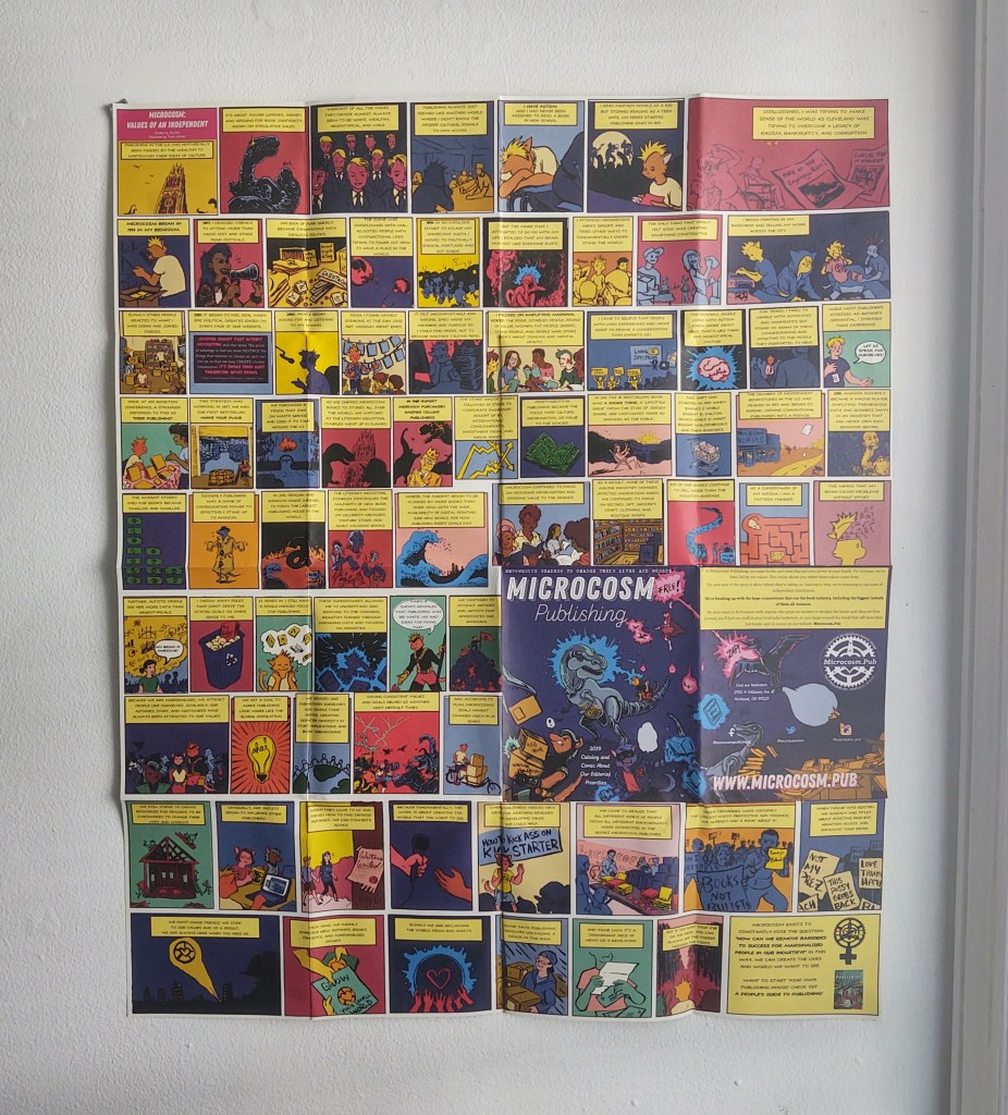 The one time I bought a book from Microcosm’s website, they sent my order with seemingly every piece of marketing literature they had laying around. The only one I really looked at was this poster. The front is their mission statement told in a comic format and the back is their catalog with an order form. It’s a lot of tiny text, but the colors almost tempted me to hang it up permanently. Either way, I’m keeping it around.