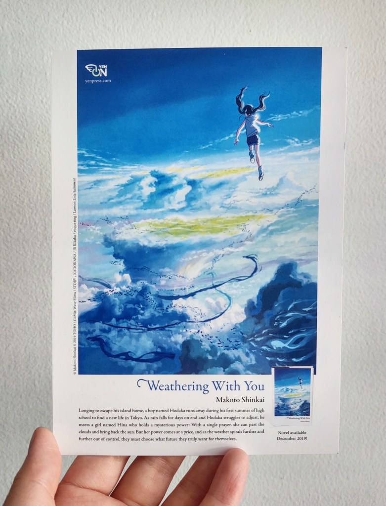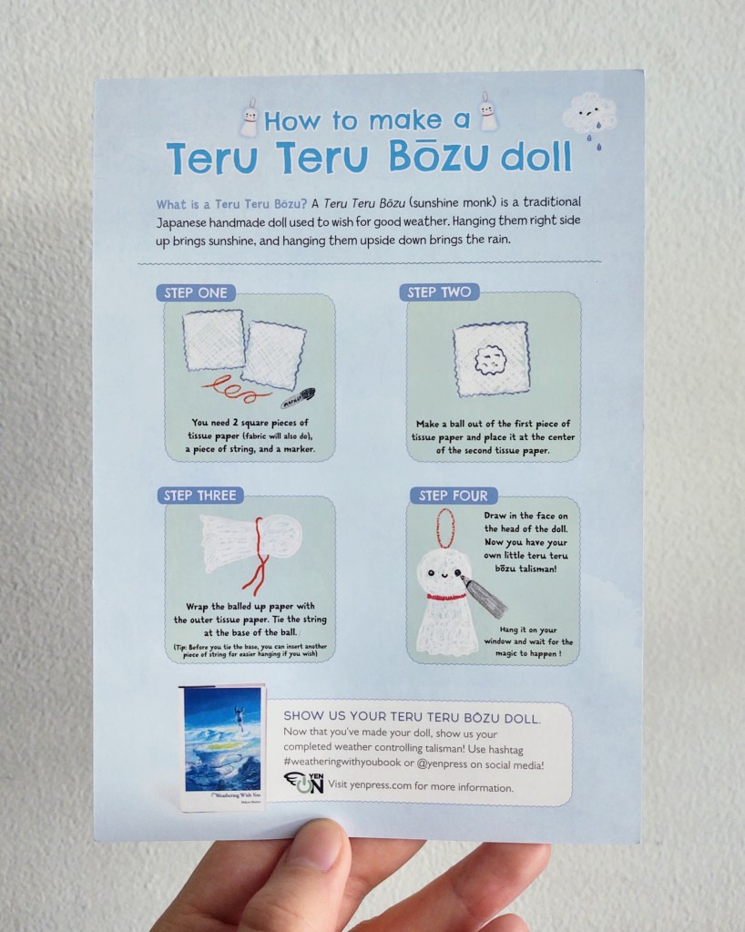 I got this Weathering with You card from a Yen Press booth. At first glance, it looked like the usual Yen Press marketing cards I’d seen previously at BookExpo and ALA Annual – glossy print, book cover on the front, buying info on the back. So I was delighted to turn it over and find instructions on how to make a teru teru bozu. I haven’t read (or watched) Weathering with You and don’t know if a teru teru bozu appears, but I do know the story is about a girl who can control the weather, and this activity is a sweet way of illustrating that theme.