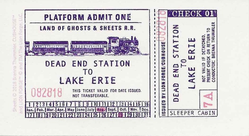 These little “business cards” from Lion Forge were unlike anything I’ve seen. The first, promoting Ezra Claytan Daniels’ Upgrade Soul, is supposed to be the business card for one of the book’s fictional doctors. The “hand scribbled” note about the follow-up date – September 18th – was the release date for the Lion Forge edition. (The comic was originally published as an app and then released in four print issues with Radiator Comics.) The second uses the convenient business card size to make a train ticket from Sheets. This little ticket packs in a ton of book information. The trip date, August 18th, is the book’s release date. The train company name incorporates the book title and “ghosts,” a major plot point. The issuer is the publisher and Cubhouse, Lion Forge’s children’s imprint, and the conductor is “Brenna Thummler,” the book’s author.
