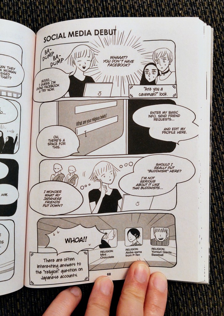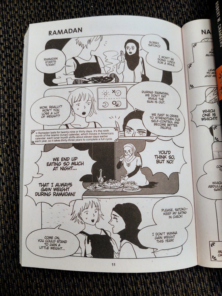 Yupechika’s Satoko and Nada from Seven Seas Entertainment is a 4-koma about two international college students — one from Japan, one from Saudi Arabia — sharing an apartment in New York. Many of its strips are more explanations of Muslim and American culture than gags, but there are occasional punchlines based their cultural discoveries and misunderstandings. There are no back translation notes, and cultural context is often included alongside the strips, usually within text boxes that were most likely in the original Japanese editions.