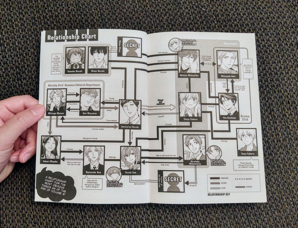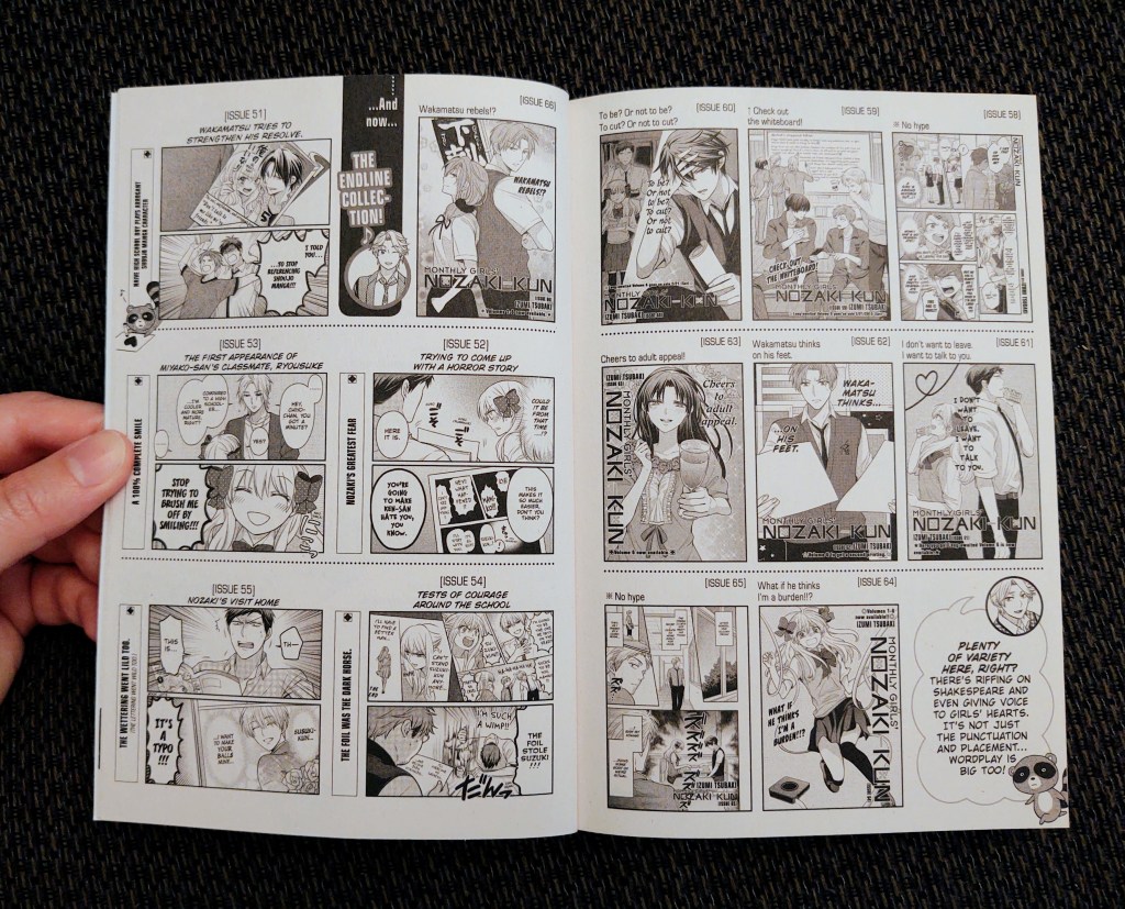 Jump ahead eight years and we have the sixth volume of Yen Press’s editions of Izumi Tsubaki’s Monthly Girls’ Nozaki-kun, a romantic comedy about a teenage manga-ka and his production assistants. The translation notes in the back of volume 6 are pretty sparse, and from volume 7 on Yen Press skips back notes all together. Maybe they figure any reader that has gotten this far into the series already has the necessary background knowledge. It could also have something to do with the fact that these later volumes contain other back matter.