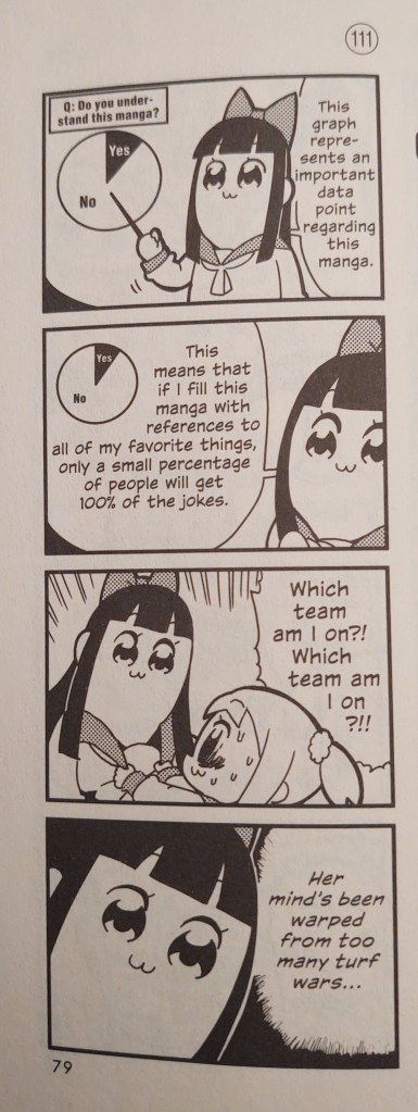 Besides, many memes today come from a long line of permutations, or have evolved convergently, or are merely reflections of each other, but very rarely are we able to witness a meme’s full life cycle in real time. (Look, I am no longer ashamed about sending my advisor a Know Your Meme link to expedite an argument I was trying to make.) Comprehensive editorial notes à la Azumanga Daioh would have turned Pop Team Epic into a lecture on internet virality and culture, which defeats the entire point of, well, making a statement in four panels.
