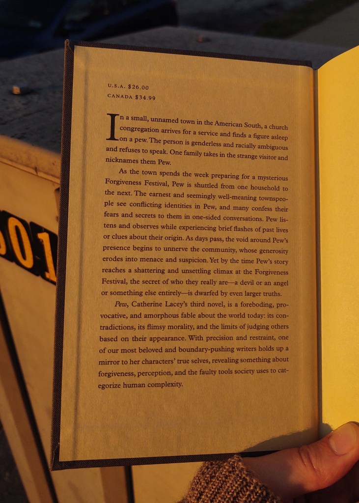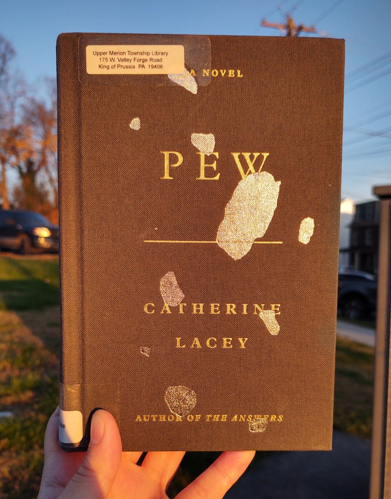 Outside of Twitter, I’ve been thinking a lot about the book design of Catherine Lacey’s Pew. I didn’t look very closely at the cover on its Goodreads page, so I was very surprised when I picked it up from the library. It’s jacketless and cloth bound. All of its outside cover features — yes, even the blurbs — are gilded debosses. The synopsis and author profiles are printed on the inside covers. Not even FANGS went that far!