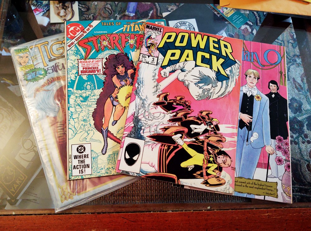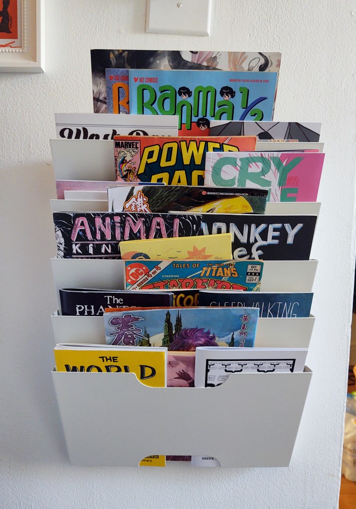 My inner librarian wanted to categorize them somehow. By publisher? By creator? By theme? And then I remembered that the reason I got these racks in the first place was so I could see my collection. Their function is aesthetic, not organizational. I threw the whole categorization idea out and have since been playing around with arrangements that support visibility.